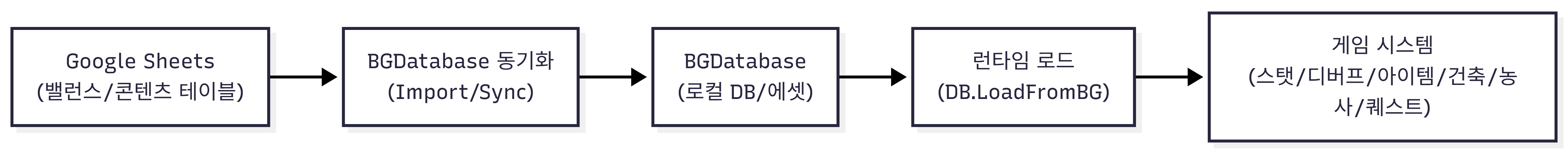 Data Pipeline (BG DB) Goal Re:Bloom은 아이템·퀘스트·건축·농사·스탯 등 시스템이 많고, 밸런스/콘텐츠가 빠르게 바뀌는 프로젝트입니다. 이를 코드 수정 없이 확장·운영할 수 있도록 BG Database 기반의 데이터 테이블 파이프라인을 구축했습니다. 기획/운영 데이터는 테이블에서 관리 런타임에 테이블을 로딩해 시스템에 주입 시스템은 “데이터를 읽어 동작”하도록 설계하여 콘텐츠 확장 비용을 최소화 System Overview
