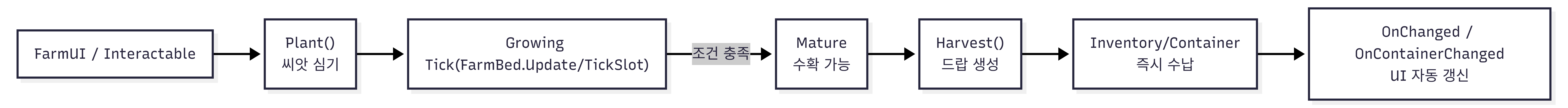 FarmBed가 “상태(슬롯)”를 Tick하고, DB로 “규칙”을 가져와 진행시키고, 비주얼/UI는 이벤트로 따라오게 만든 구조